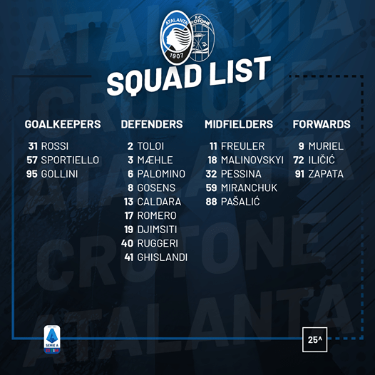 L’Atalanta ha reso noto l’elenco dei convocati per la sfida di domani al Crotone (ore 20:45). Sono 20 i calciatori chiamati. Assenti Hateboer, Sutalo, Lammers e Kovalenko oltre allo squalificato De Roon. Rientra Zapata. Questo l’elenco completo dei convocati.