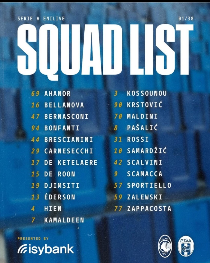 L’Atalanta ha reso noto l’elenco dei convocati per la partita valida per la 1/a giornata di Serie A 2025/2026 in programma questa sera alle 20:45 con il Pisa.