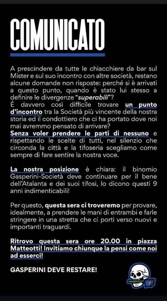 Nella foto seguente, il comunicato del gruppo “Ultras” sulla vicenda Gasperini. Ne approfittiamo per dire anche la nostra sulla vicenda. Ringraziamenti a vita al più grande allenatore della storia dell’Atalanta, ma per noi Gian Piero Gasperini è già un ex. E la società si dimostrerebbe senza dignità professionale se il tecnico dovesse ripensarci.