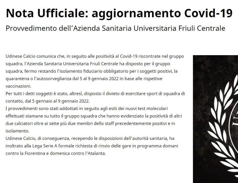 L’ASL di Udine ha disposto il divieto all’Udinese di esercitare attività sportiva dal 5 al 9 gennaio, causa le numerose positività al COVID-19 nei friulani. Salta così anche Udinese-Atalanta, prevista domenica 9 gennaio.